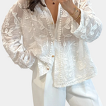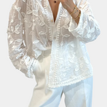 Material y confección: Confeccionada en encaje transparente y bordado de hojas, la camisa presenta acabados cuidados y botones en tono dorado que realzan su carácter refinado. El encaje ofrece una sensación ligera y aireada, mientras que los bordados añaden textura y detalle artesanal.