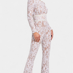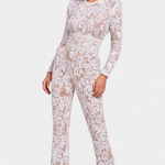 Material y confección: Confeccionado en encaje bordado con lentejuelas sobre una base translúcida, el mono combina encaje delicado y lentejuelas brillantes para un acabado premium. El tejido principal es encaje con aplicación de lentejuelas, que resulta ligero pero resistente; la base translúcida ofrece un tacto suave y una caída fluida que realza el movimiento.