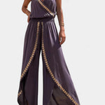 Beneficios y características clave: El diseño presenta un cuello cruzado que estiliza el escote y una espalda descubierta que aporta un toque femenino y moderno. Las aberturas adornadas con bordes dorados actúan como un acento refinado, mientras la cintura elástica se adapta a distintos cuerpos proporcionando ajuste y comodidad. La silueta holgada facilita la movilidad y favorece múltiples tipos de figura, convirtiendo al mono Donatila en una prenda versátil y cómoda para cualquier plan.