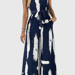 Beneficios y características clave: La silueta de pierna ancha proporciona libertad de movimiento y una caída elegante que estiliza la figura. El corte sin mangas mantiene el conjunto fresco y minimalista, ideal para climas cálidos. La cintura con lazo ajustable realza la silueta de forma natural y femenina, mientras que el estampado discreto da un toque contemporáneo que facilita su combinación con accesorios tanto para un look casual como más arreglado.