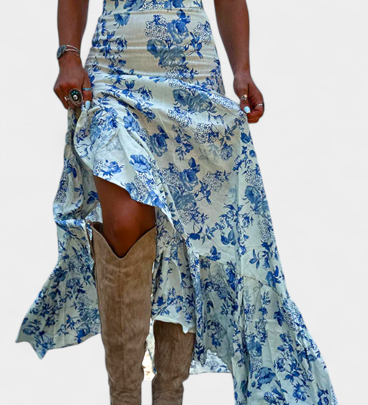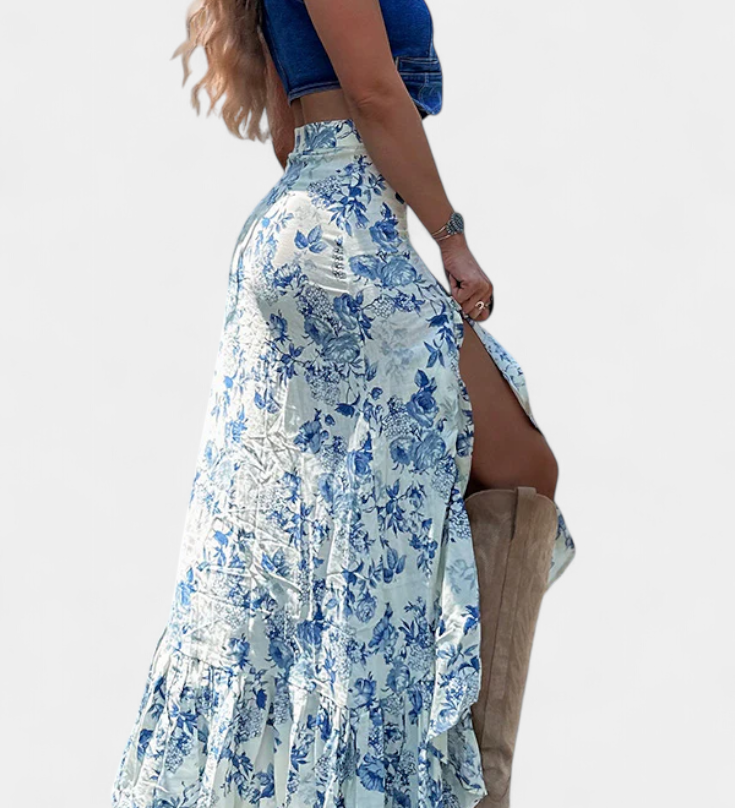Lucía – Falda Maxi Floral Azul Que Estiliza La Figura