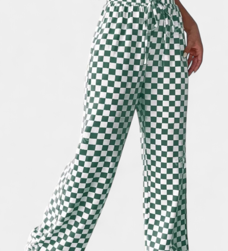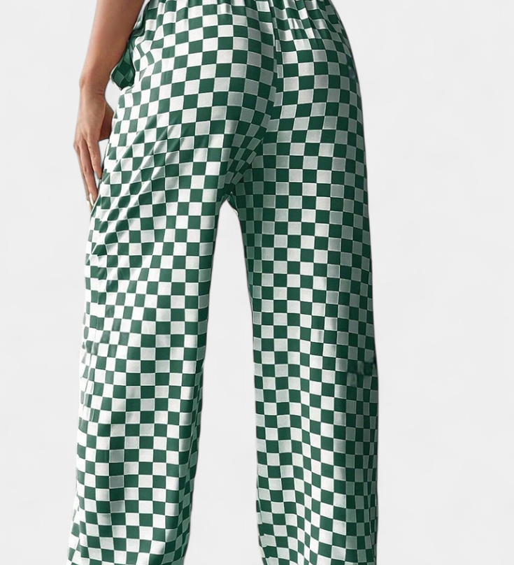 Lucía – Pantalón Pierna Ancha Estampado Cuadros Que Realza