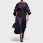 Material y confección: Confeccionado en satén de mezcla de poliéster y elastano, el vestido Aurora ofrece un tacto suave y ligeramente elástico que se adapta al cuerpo. El tejido de alta calidad aporta un brillo elegante, es resistente al desgaste y mantiene su forma, proporcionando un acabado premium y fácil cuidado.