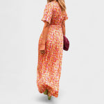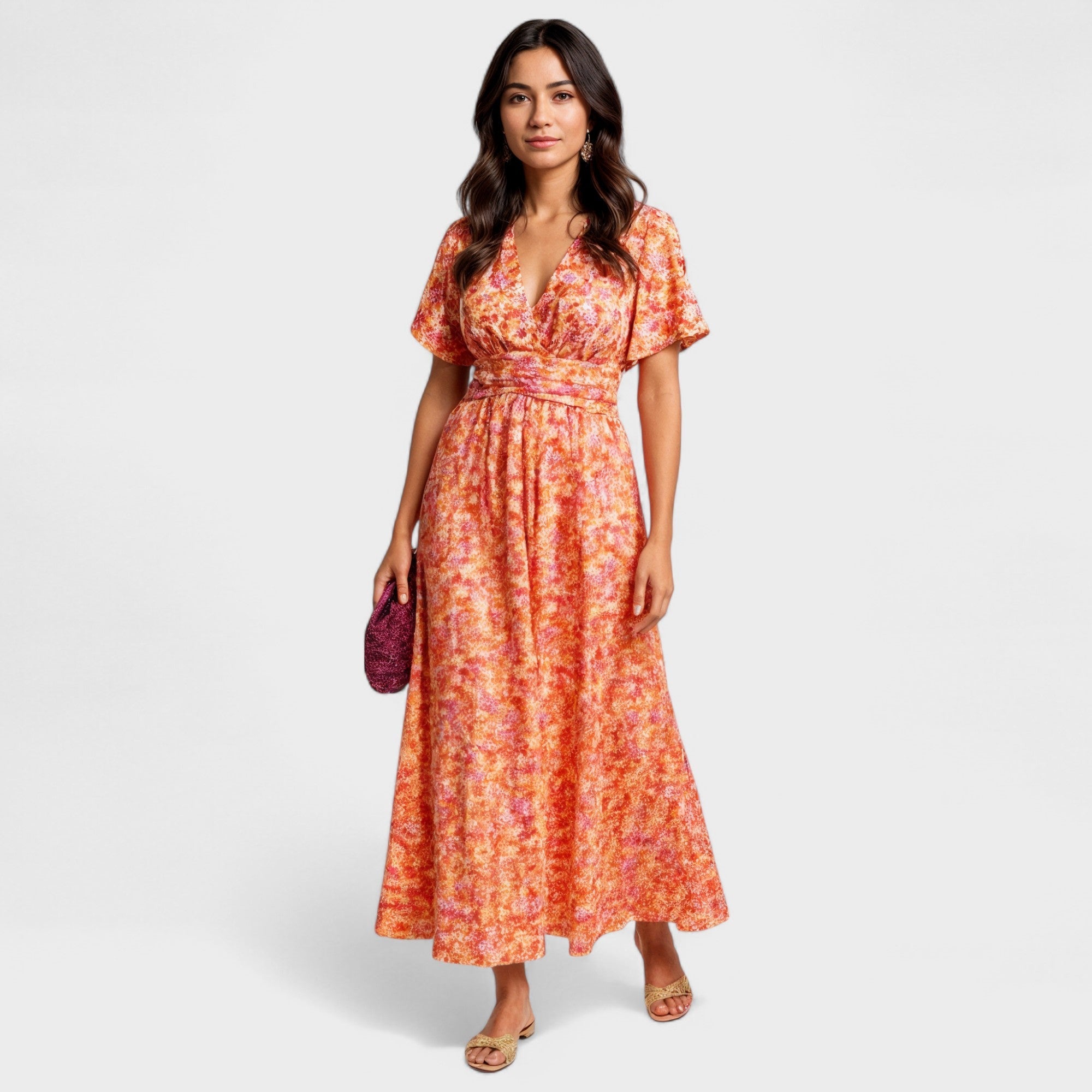 Claudia – Vestido Que Estiliza Con Encanto Floral Radiante: un vestido maxi que combina elegancia y frescura para tus días soleados y eventos casuales. Su diseño con escote en V y cintura fruncida realza la silueta con un aire sofisticado y femenino, perfecto tanto para un almuerzo de verano como para una cena informal con estilo.