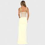 Isabel es un vestido de brillo sutil pensado para momentos especiales: elegante, femenino y con presencia, diseñado para ocasiones formales o cenas nocturnas. Su silueta abraza el cuerpo con naturalidad, mientras el corpiño con encaje transparente y los tirantes finos añaden un toque de sensualidad discreta que realza tu estilo sin esfuerzo.