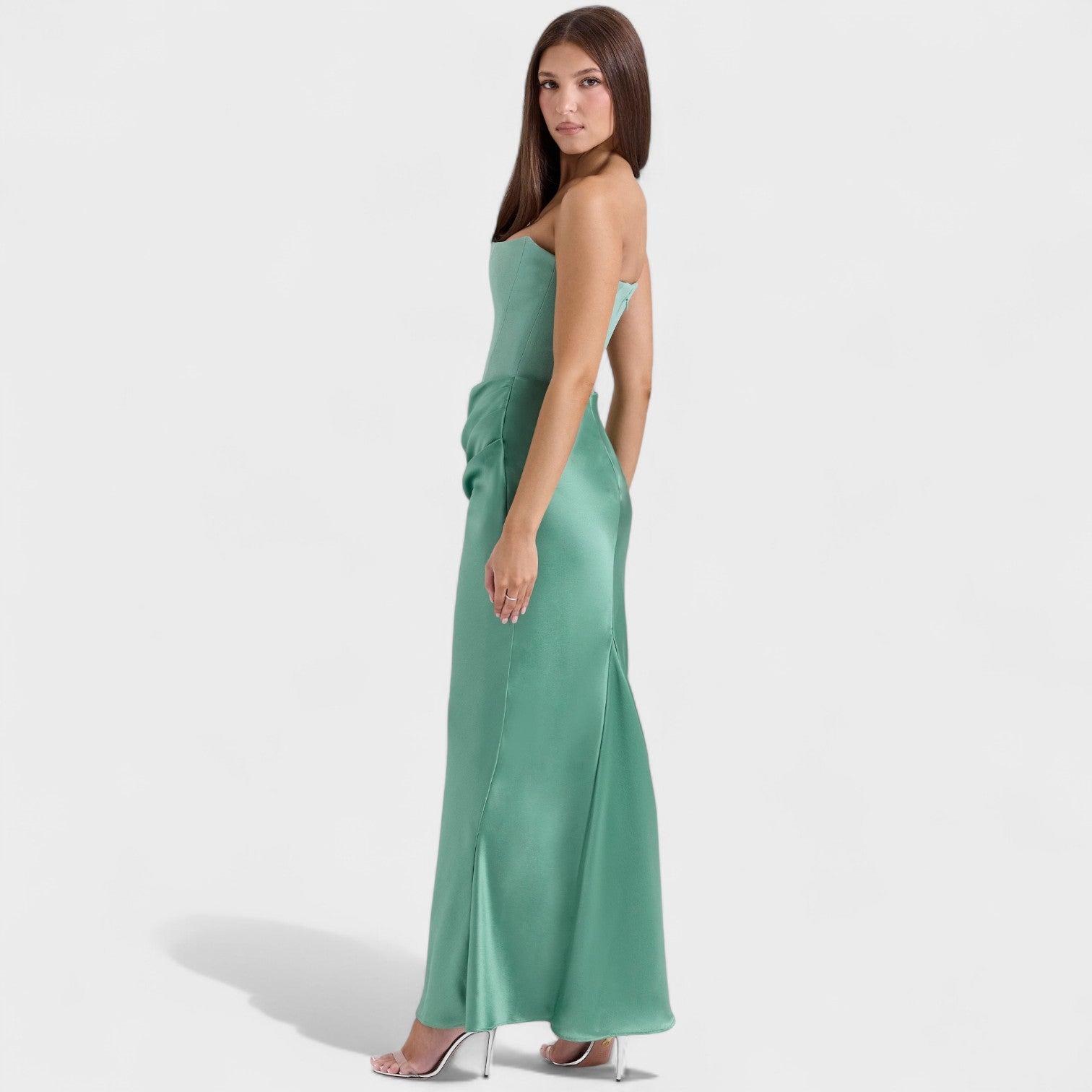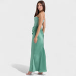 Material y confección: Confeccionado en una mezcla de satén y poliéster con un toque de elastano, el tejido ofrece un acabado suave, ligero y ligeramente brillante que aporta caída y movimiento. El forro interior en viscosa garantiza transpirabilidad y confort, mientras que las costuras y el corsé están reforzados para un ajuste duradero y de alta calidad.